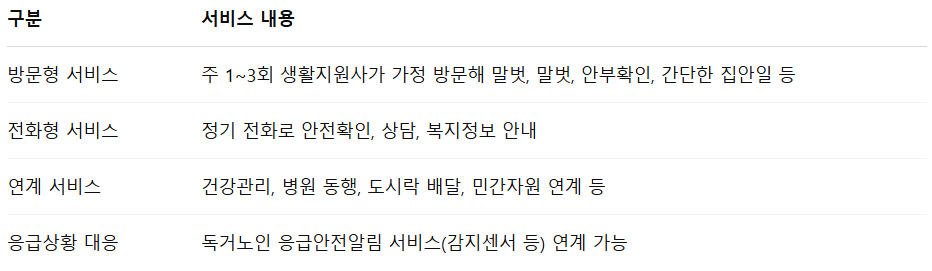 정부 또는 지자체가 혼자 생활이 어려운 어르신에게 돌봄 인력을 파견하거나 정기 방문·안부 확인 등을 지원해주는 복지서비스입니다.